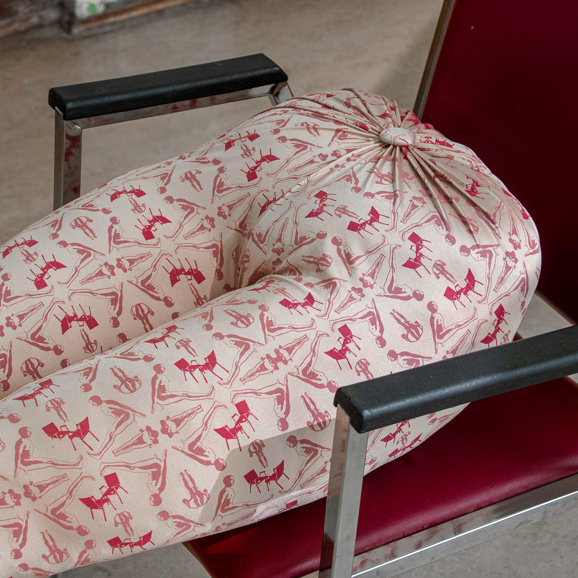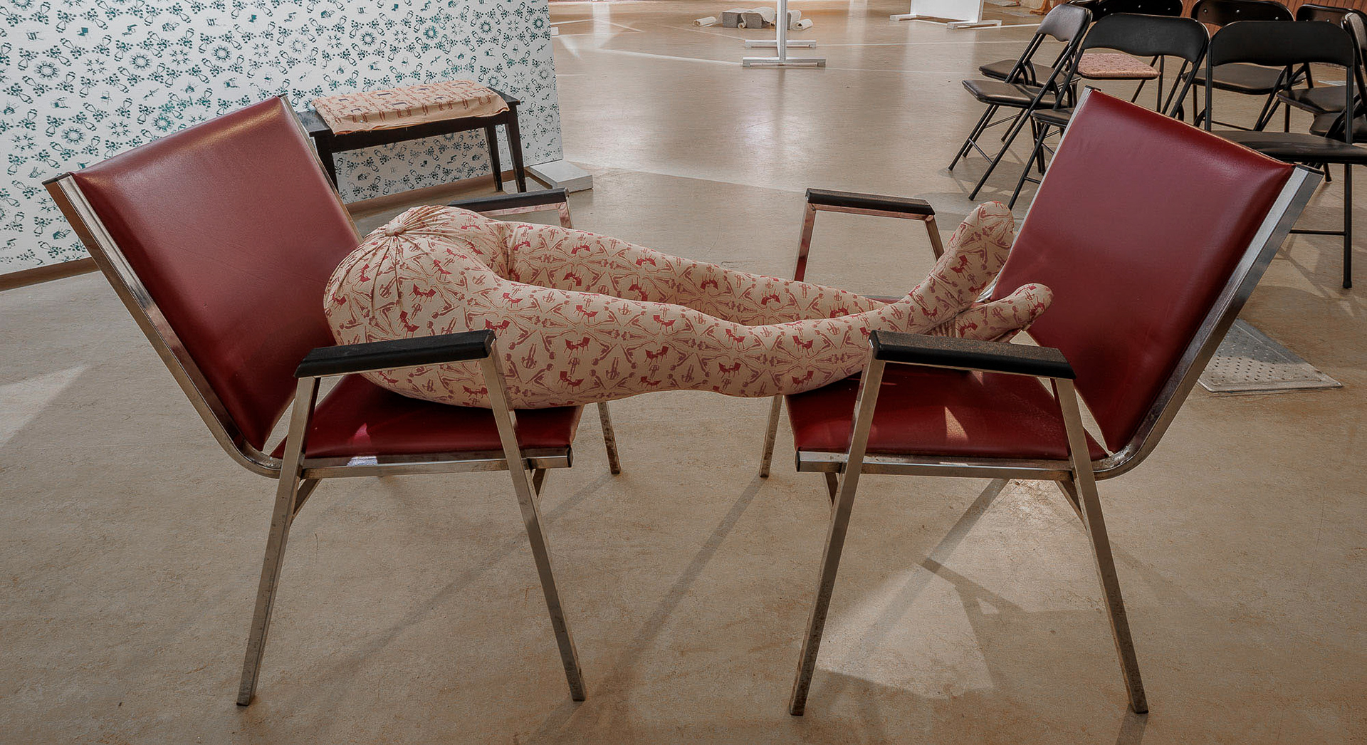 Encre de sérigraphie, mousse de polyuréthane, tissu, chaises rouges